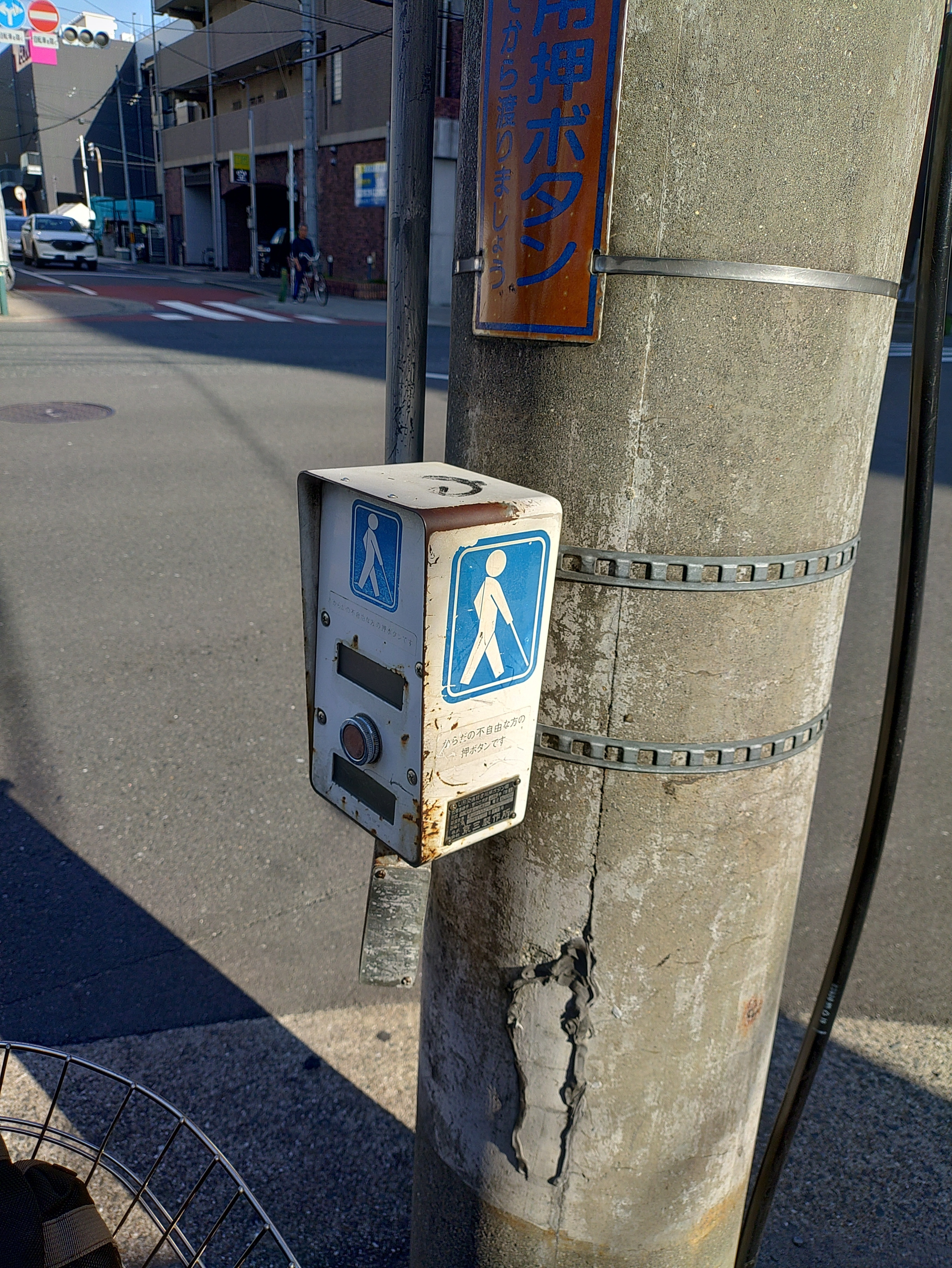 交差点の白い交通弱者ボタン(ボロボロ)