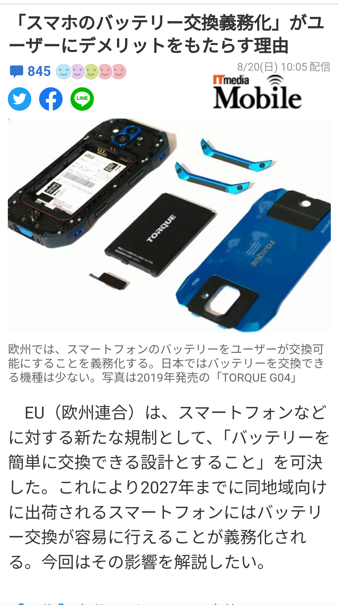 これにより2027年までに同地域向けに出荷されるスマートフォンにはバッテリー交換が容易に行えることが義務化される。』