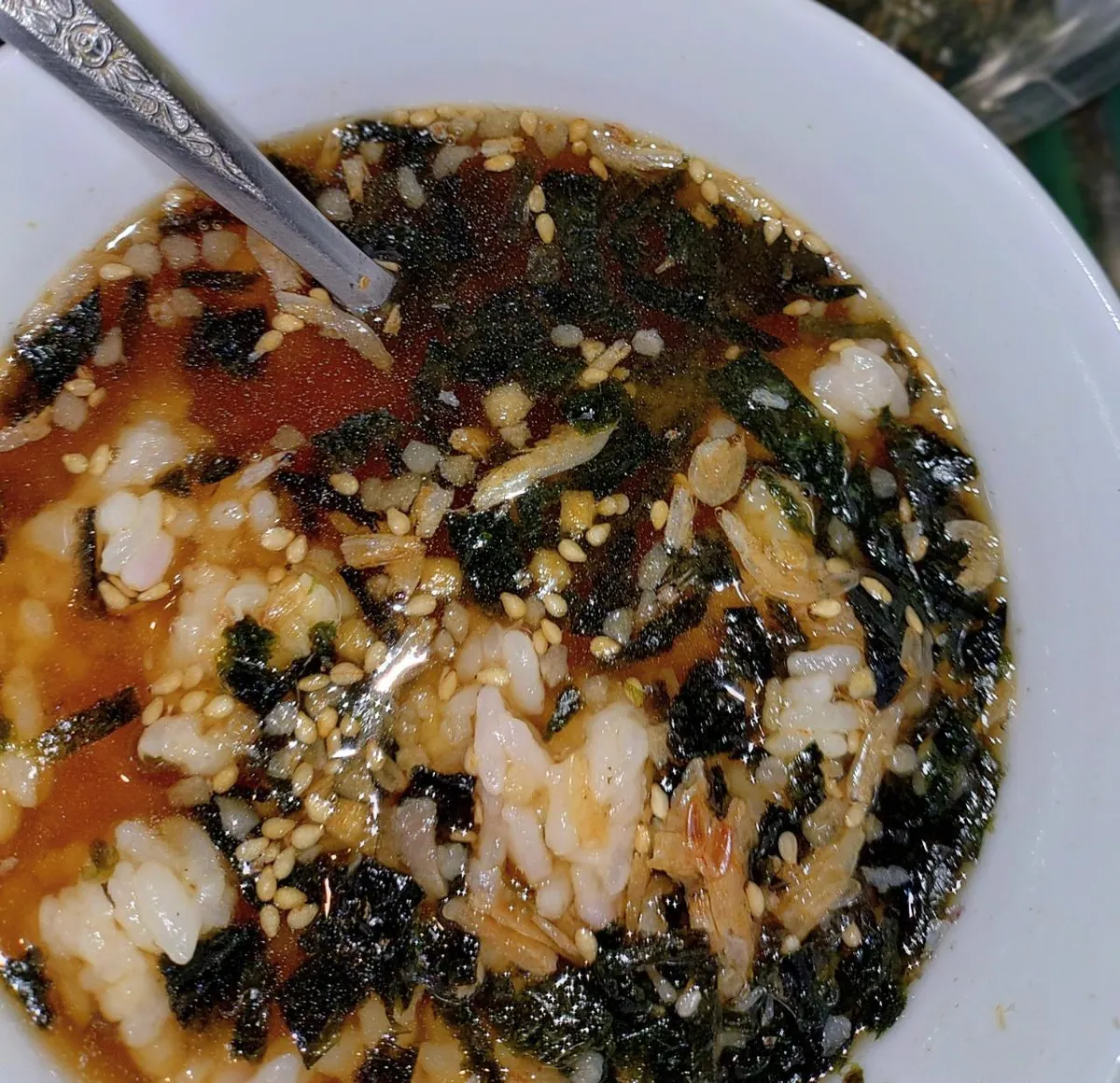私が今回作ったのは、お椀に八丁味噌を入れて、熱湯で溶かし、ご飯を入れて、「カルディ」で売っている海苔がたくさん入ったふりかけをかけたものです(笑)💕🐑🍚🍵💕