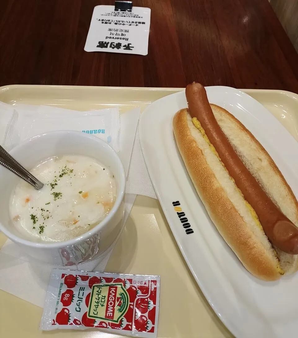 ヨーカドー内のドトールで、クラムチャウダーとジャーマンドッグ