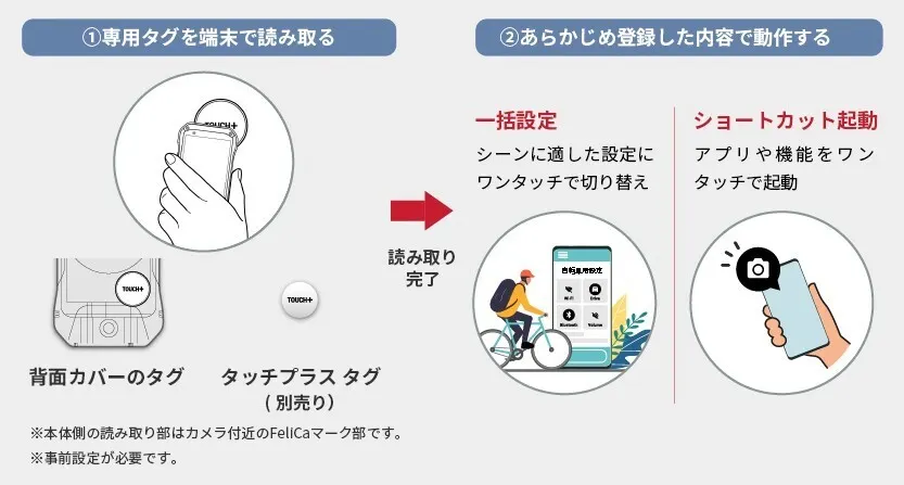 5色のカラバリに驚かれた方もいらっしゃるかもしれませんが、G07でカスタムできるのは外装だけではありません。専用タグで中身の設定を一括で切り替えたり、アプリや機能を起動できる新機能——「タッチプラス」 を搭載しました!例えば、平日(仕事)と休日(アウトドア)とで外観カバーだけでなく、壁紙や着信音などの設定もワンタッチで切り替え、気分をチェンジ!といった使い方もできます。