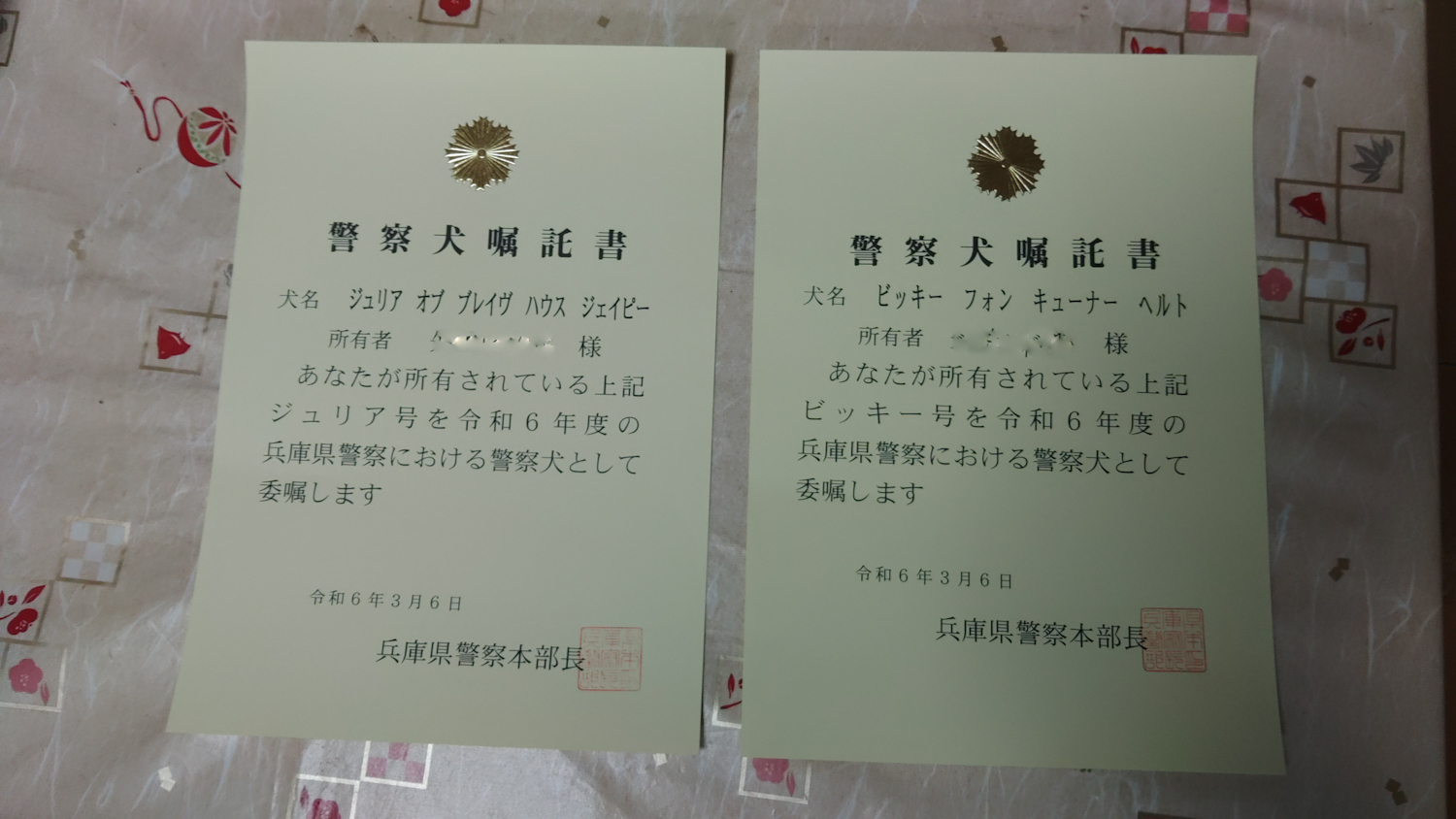 トップ > TORQUEフォト > 嘱託警察犬 ナナヨン 2024/03/15 22:14 嘱託警察犬 令和6年度嘱託警察犬嘱託書が今日届きました。 足跡追及にエミリー 捜索にクレア。 捜索は今年度より新設されクレア1頭のみの合格でした。 今まで県警では警察犬6犬種以外採用はなかったのですが、マリノアのクレアが合格で驚いています。 いいね 共有する 共有する X facebook LINE リンクをコピー コメントする 2 件の返信 (新着順) ミュートしたユーザーの投稿です。 投稿を表示 にしもん@50s pro 2024/03/16 07:19 捜索活動の時に指名できるんですかね😀✨☕⁉️ いいね 返信する ミュートしたユーザーの投稿です。 投稿を表示 ナナヨン 2024/03/16 11:35 にしもん@50s pro コメントありがとうございます。 現場の状況で指名がくるものと思います。 足跡追及犬と捜索犬の匂いの捕り方が違うので。 今回マリノアが採用されたので大きな成果でした。 いいね 返信する ミュートしたユーザーの投稿です。 投稿を表示 なか 2024/03/16 05:48 現場に行くんですね いいね 返信する ミュートしたユーザーの投稿です。 投稿を表示 ナナヨン 2024/03/16 11:31 なか コメントありがとうございます。 直轄警察犬が間に合わない場合に要請がきて現場に行きます。 いいね 返信する
