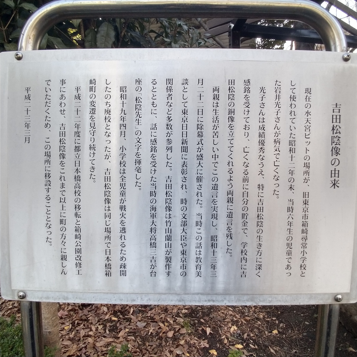 トップ > TORQUEフォト > 夜の吉田松陰先生 t-yashiki 2024/01/23 22:38 夜の吉田松陰先生 ※以降、つボイノリオネタは自粛願います 夜の公園でライトアップされている吉田松陰像🗿 なぜこの公園にあるのかもけっこう謎(その志は立派なのですが)🤔🤔🤔 いいね 共有する 共有する X facebook LINE リンクをコピー コメントする 1 件の返信 (新着順) ミュートしたユーザーの投稿です。 投稿を表示 にしもん@50s pro 2024/01/24 00:26 最近出来た銅像の様ですね😀🍺 いいね 返信する ミュートしたユーザーの投稿です。 投稿を表示 t-yashiki 2024/01/24 00:57 にしもん@50s pro おそらくこの場所に移設したときにきれいにしたのだと思います(特に座っている礎の部分)🗿🗿🗿 由来ちゃんと読んでいなかったので、それこそH23にいきなり新設したのかとずっと思っていたくらいですし😑😑😑 昼間見るとこんな感じ🗿 いいね 返信する ミュートしたユーザーの投稿です。 投稿を表示 にしもん@50s pro 2024/01/24 06:43 t-yashiki 生花だと枯れてしまいますが鉢植えだとずっとありますね😀☕地元の方のナイスアイデア💡✨ いいね 返信する