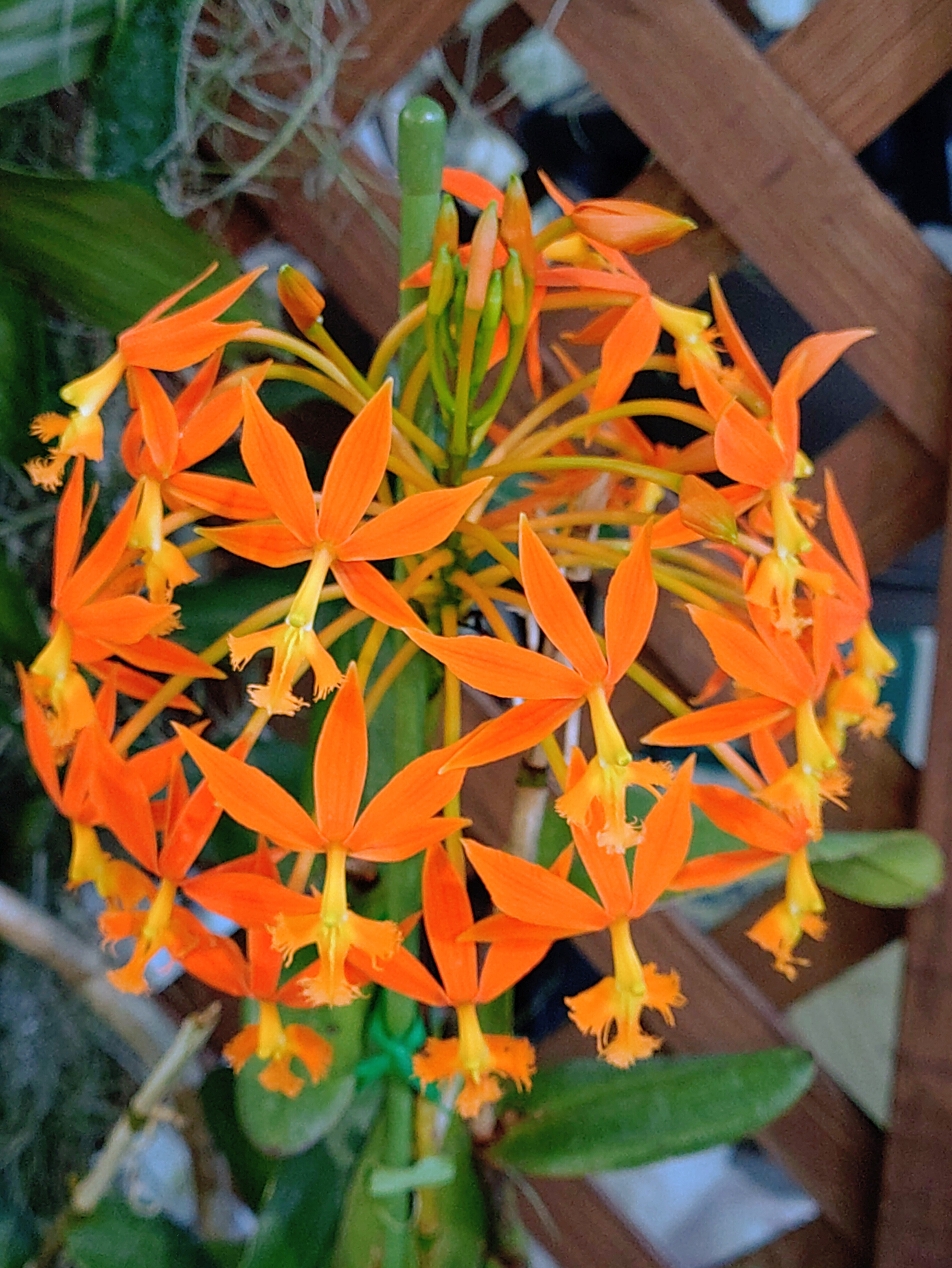 小さなオレンジ色の蘭が集まって、丸いボールのような形を作っています。