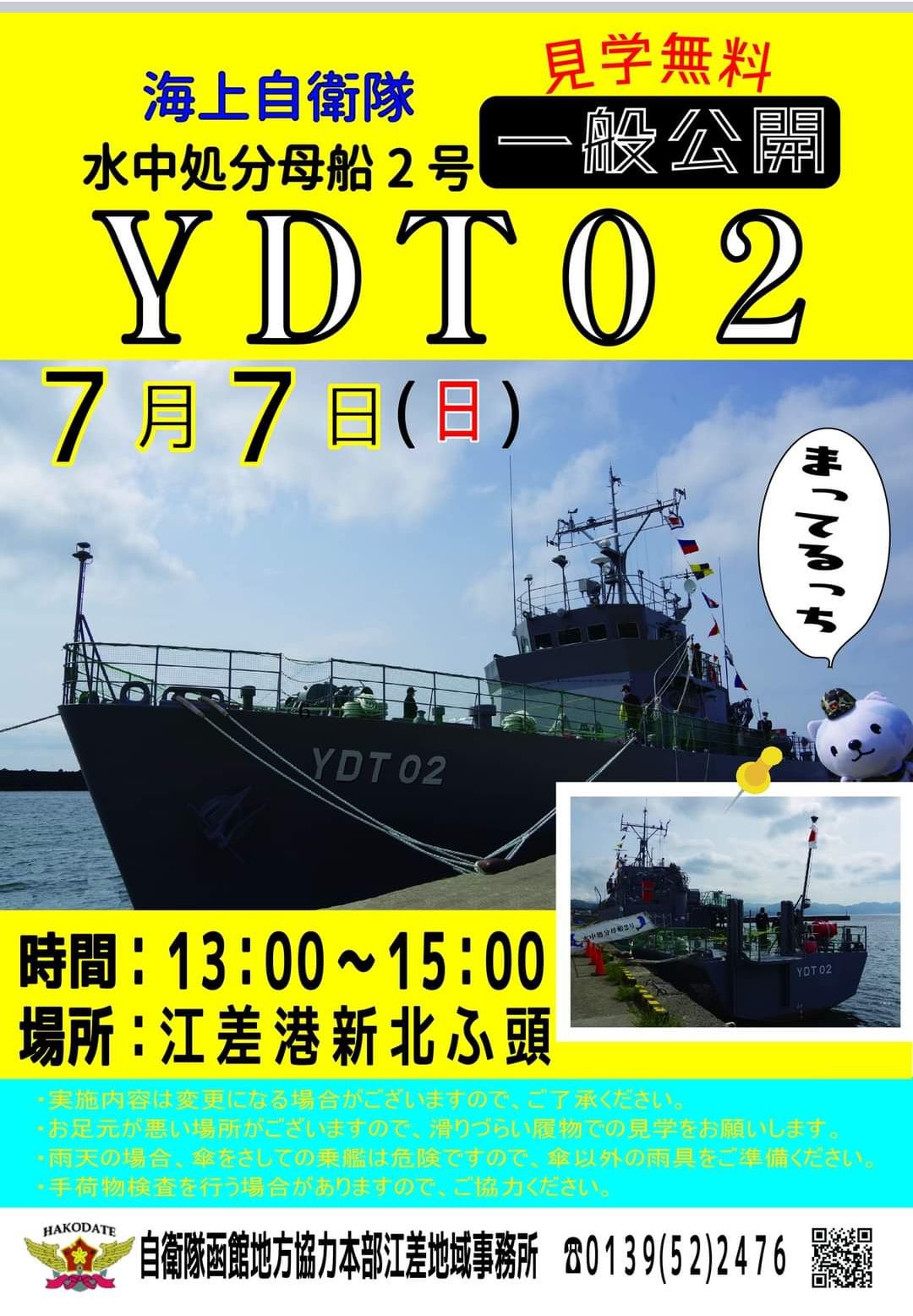 トップ > TORQUEフォト > 江差に珍しい艦艇が~😆 きな☆彡 2024/05/24 08:09 江差に珍しい艦艇が~😆 【艦艇一般公開のお知らせ】 海上自衛隊水中処分母船2号(YDT02) ☆ 6月9日(日)松前郡福島町 福島漁港☆ 7月7日(日)檜山郡江差町 江差港新北ふ頭 派手な護衛艦とは違い甲板だけではなくブリッジ(艦橋)位は見れると思います~😆 いいね 共有する 共有する X facebook LINE リンクをコピー コメントする 3 件の返信 (新着順) ミュートしたユーザーの投稿です。 投稿を表示 二次元ガレージ 2024/05/24 13:07 確かにあまり見ないですね( ・ω・) いいね 返信する ミュートしたユーザーの投稿です。 投稿を表示 ナナヨン 2024/05/24 11:51 珍しい艦艇ですね見たことないです。 いいね 返信する ミュートしたユーザーの投稿です。 投稿を表示 にしもん@50s pro LEGEND (2024) 2024/05/24 09:41 北海道😀💦見慣れない電話番号でした😀✨👍 いいね 返信する