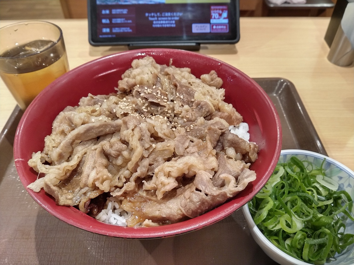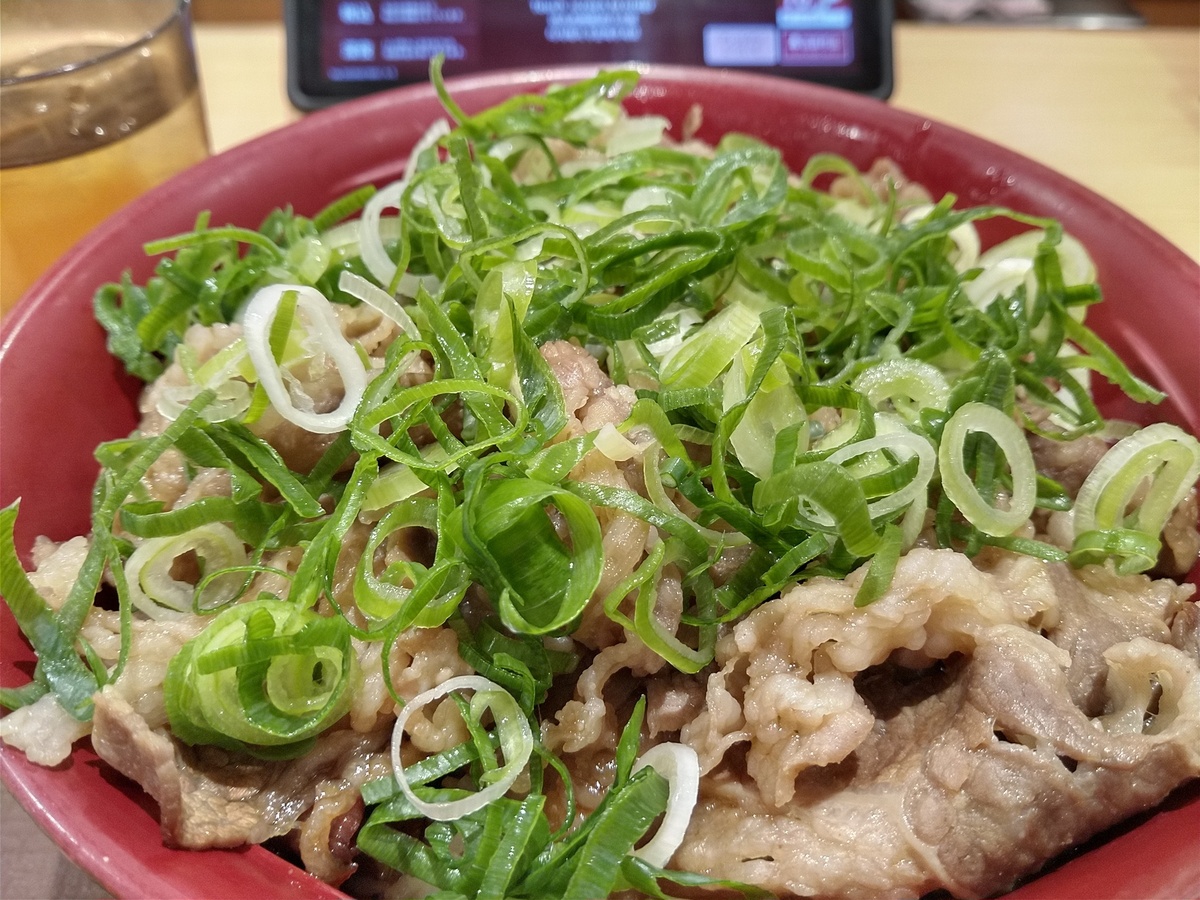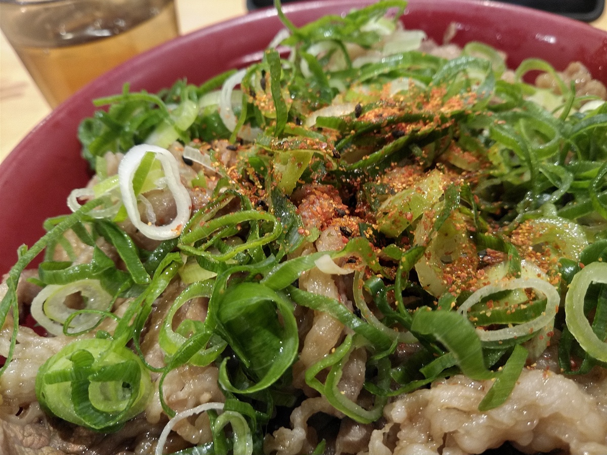 (^-^)すき家の期間限定牛カルビ焼肉丼特盛に葱トッピングです。