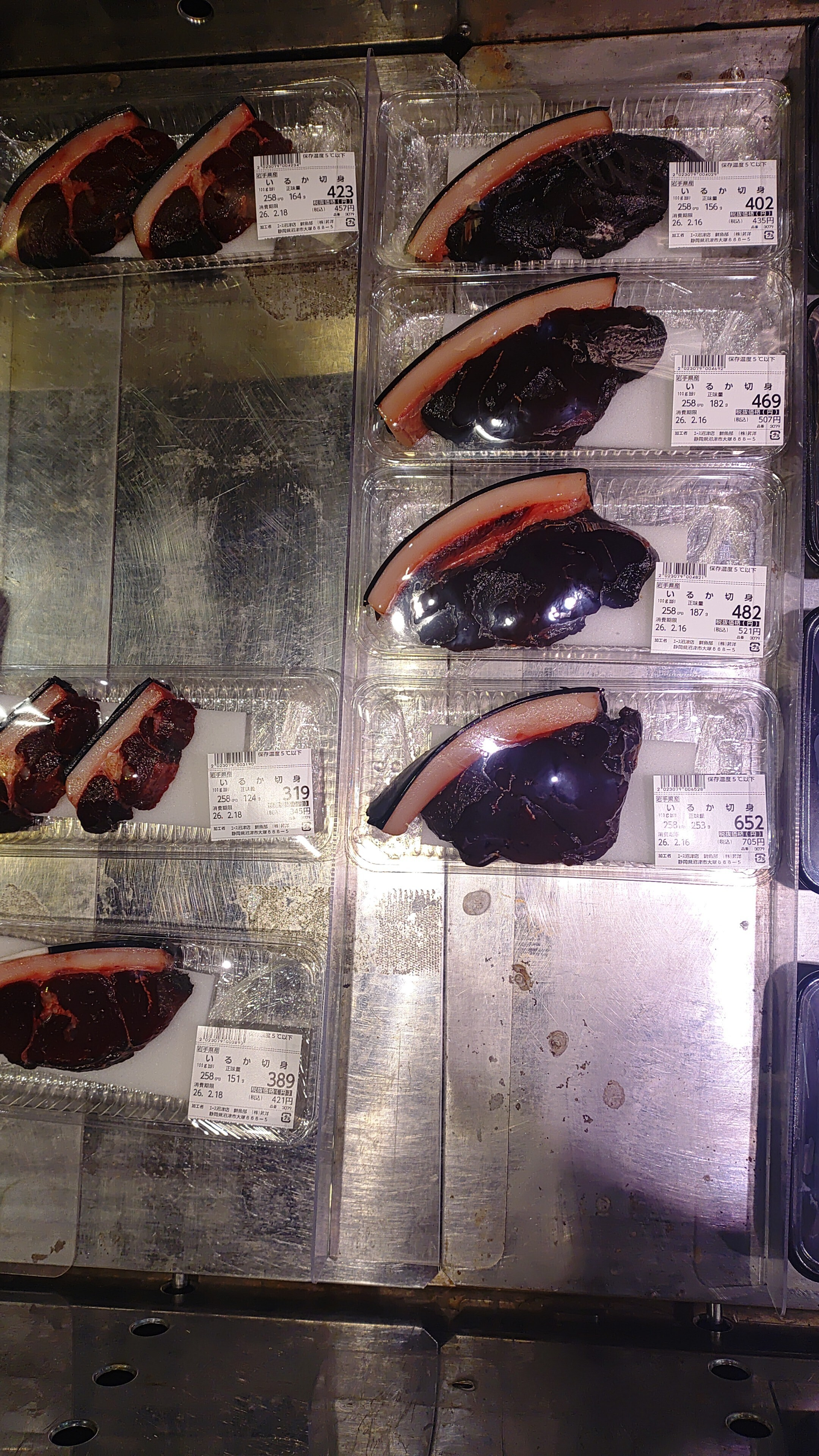 この辺りでも珍しい「イルカの切り身」が売ってたり、「生食用クジラの刺身」が置いてあったり買う勇気は無いけれどどんな味なのかは興味あります😅