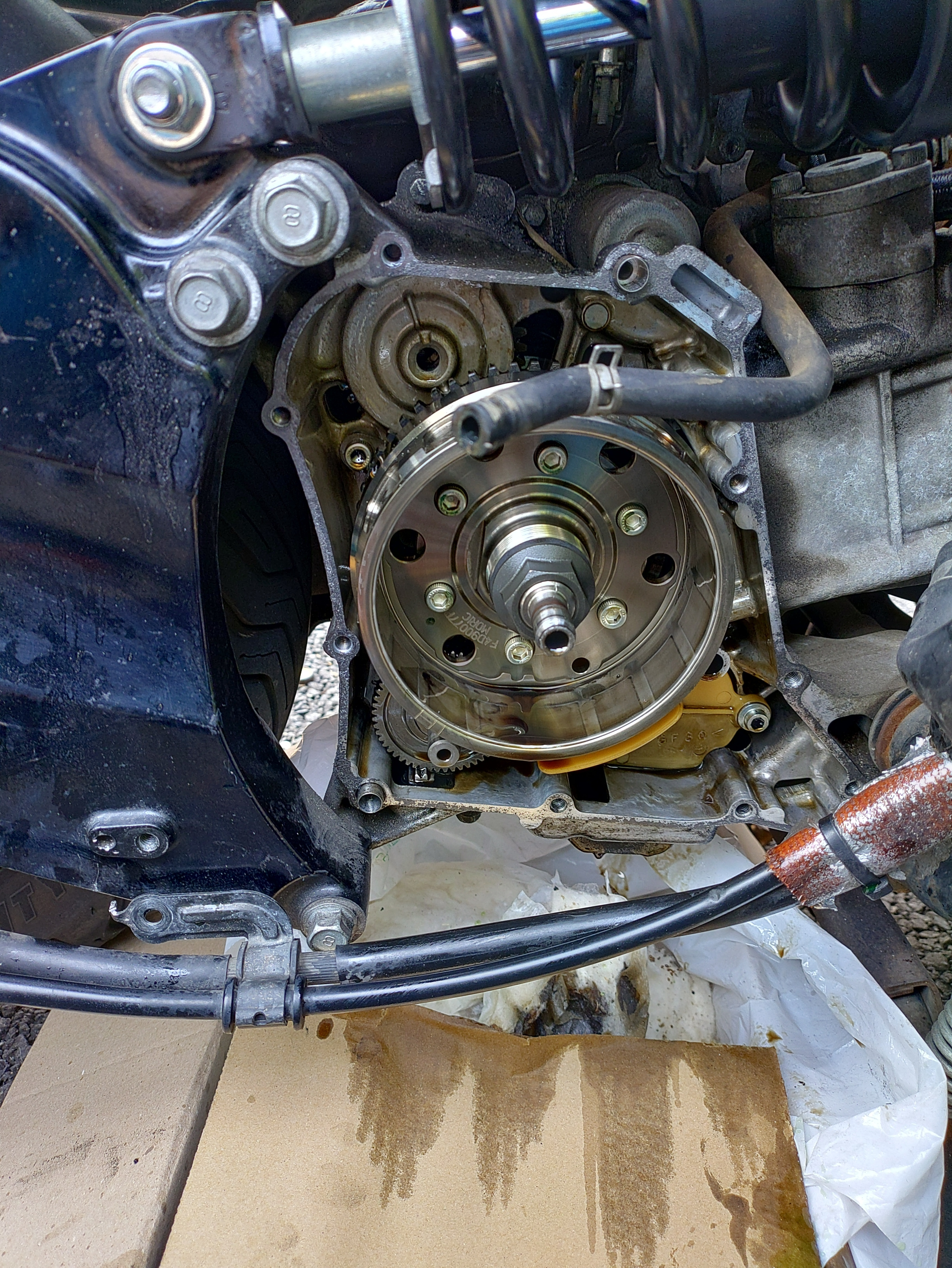 ステップから後ろの外装を外してマフラーを外してやっとステーターカバーが外せます。すったもんだと外すと