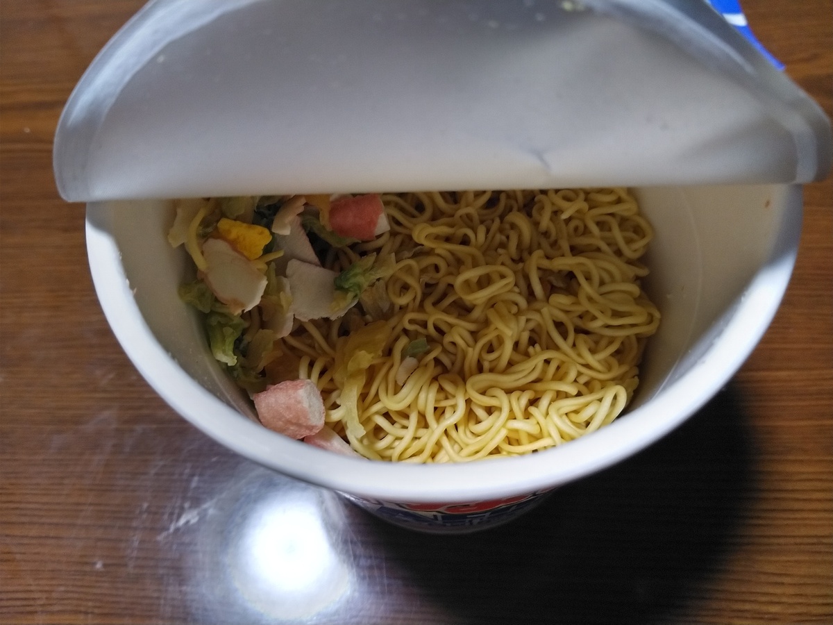 蓋を開けるとこんな感じ…シーフードヌードルの粉なし版?