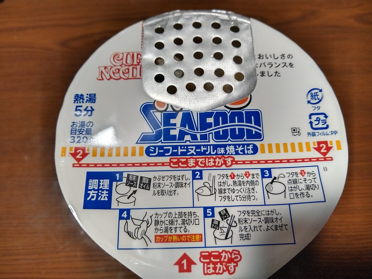 お湯を注ぎ5分!…湯切りしたらシーフードヌードルの汁なしやん