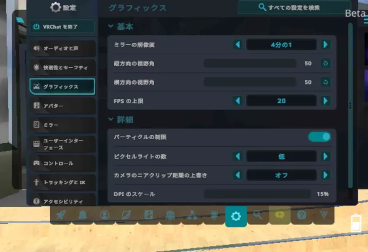 「設定」→「グラフィックス」のミラーの解像度を「1/4」にする。表示される画質は荒くなりますが、VRchat内カメラでの写真は綺麗に撮れました(2枚目の画像)