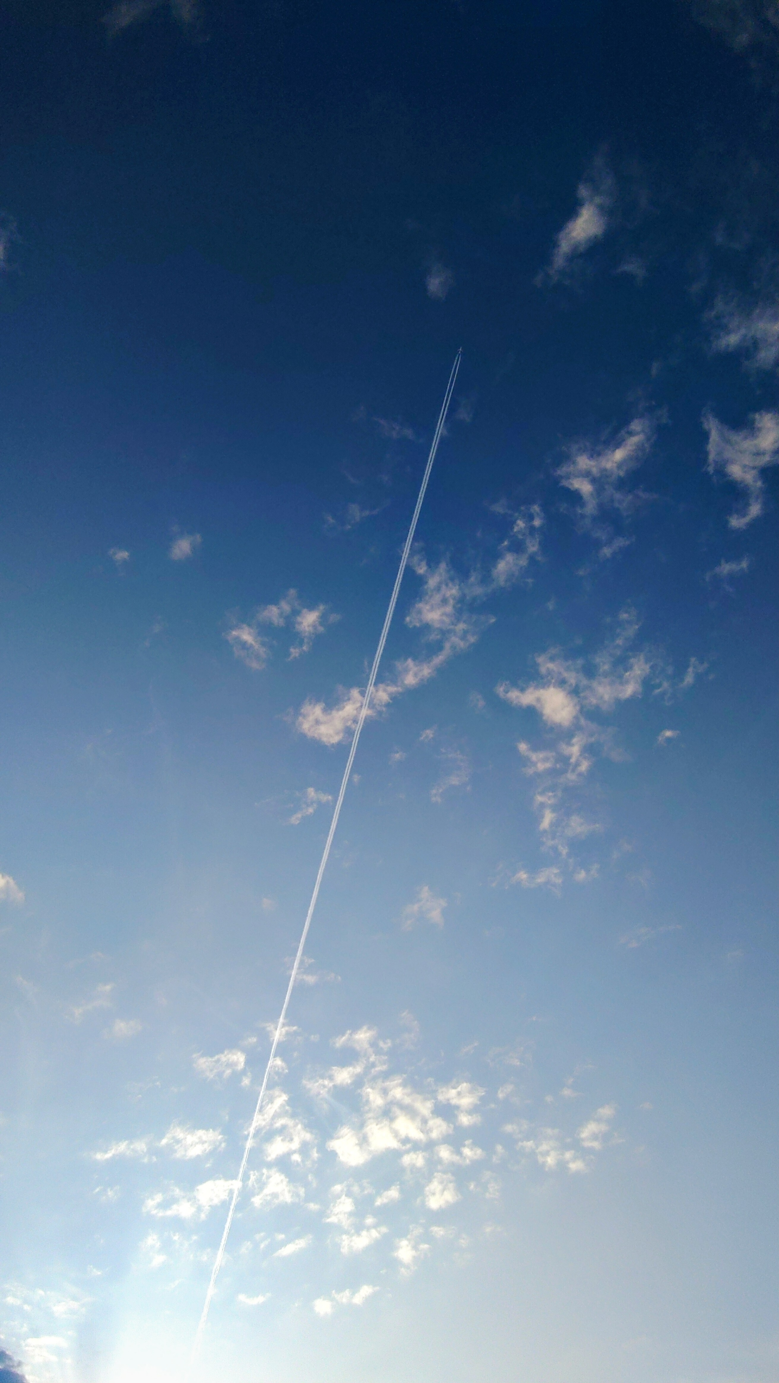 青いグラデーションの空に真っ直ぐ伸びる白い飛行機雲一線