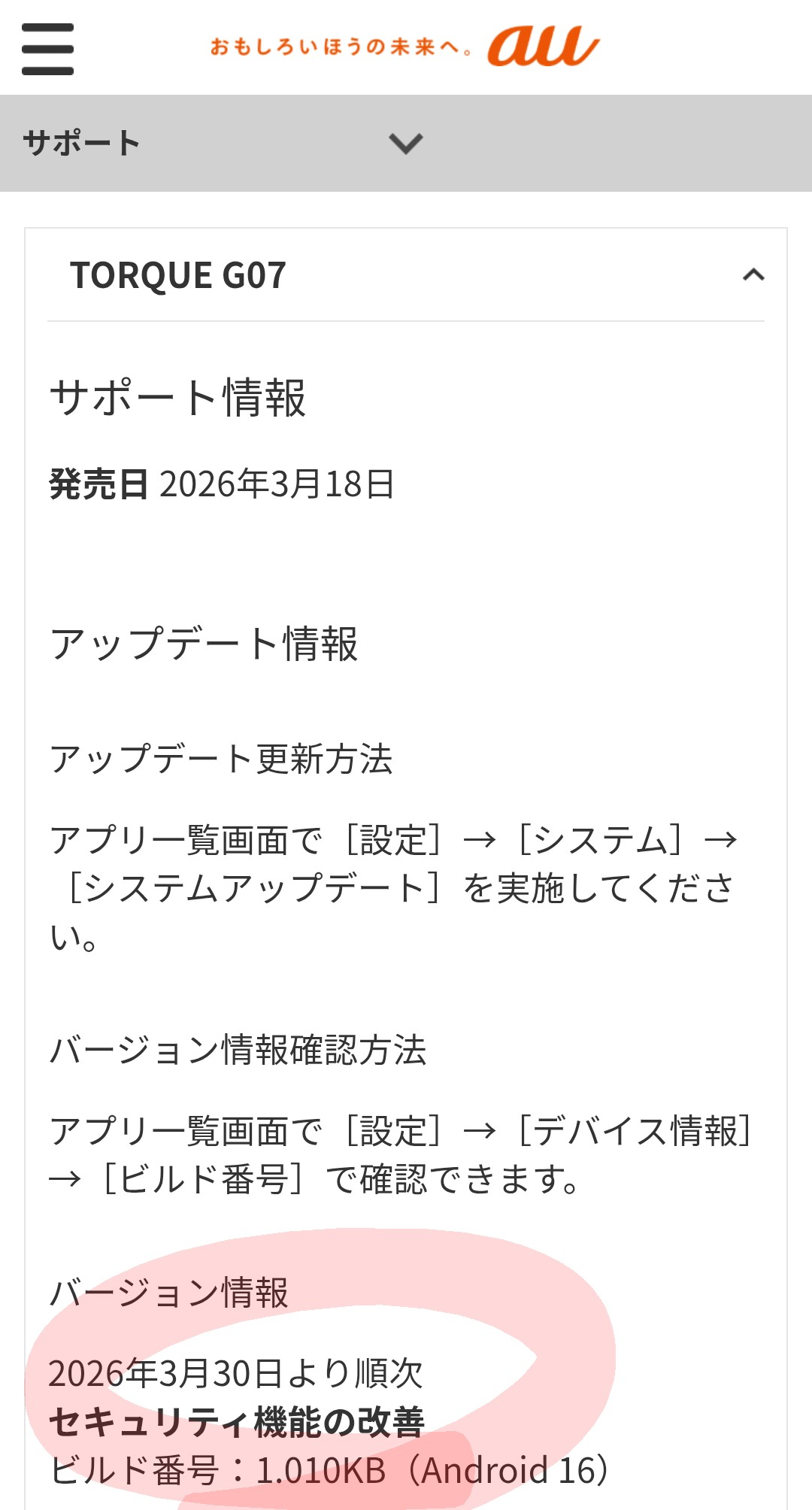 トップ > TORQUEトーク > おすすめアプリ・サービス > アップデート情報ですアップデートは満充電にし... たろ三郎@G07 2026/04/02 15:13 <p>アップデート情報です</p><div class="se-component se-image-container __se__float-none"><figure><img src="https://community.dl-asobica.com/public/uploads/ckeditor/pictures/1080577/1d1ef1c5-cc28-4b2c-95fc-c3d94595e417.png" alt="" data-rotate="" data-proportion="true" data-size="," data-align="none" data-percentage="auto,auto" data-file-name="1d1ef1c5-cc28-4b2c-95fc-c3d94595e417.png" data-file-size="undefined" data-origin="," origin-size="1080,2008" style=""></figure></div><p>アップデートは満充電にして、電波状態の良いWiFi環境下で行うことをお勧めします。</p> アップデート情報です アップデートは満充電にして、電波状態の良いWiFi環境下で行うことをお勧めします。 TORQUE G07 アップデート いいね 共有する 共有する X facebook LINE リンクをコピー トークにコメントする 4件のコメント (新着順) ミュートしたユーザーの投稿です。 投稿を表示 やまのきのこ 2026/04/02 20:28 昨日アップデートしましたが、毎度セキュリティー云々ですね…。 いいね 返信する ミュートしたユーザーの投稿です。 投稿を表示 momoG07 2026/04/02 19:20 情報ありがとうございます、早速アップデートしました。 いいね 返信する ミュートしたユーザーの投稿です。 投稿を表示 あっくんとるく 2026/04/02 18:59 WiFi環境でのアップデートオススメします。電車移動中にしたら4Gや5Gに切替わりかなり時間かかってしまいました。。 いいね 返信する ミュートしたユーザーの投稿です。 投稿を表示 ドラえもん 2026/04/02 19:10 あっくんとるく 後、バッテリー残量には注意した方が良いですね。😊 アップデート終了後も内部では反映作業をしているので、アップデート終了後もバッテリー消費は速いと予測されますから。。。😅 いいね 返信する ミュートしたユーザーの投稿です。 投稿を表示 あっくんとるく 2026/04/02 22:50 ドラえもん 朝一、電車の中でアップデートしたので電池は大丈夫でしたが、終了後も消費するんですね。次回は必ず自宅のWiFiで実行します。 いいね 返信する ミュートしたユーザーの投稿です。 投稿を表示 ドラえもん 2026/04/02 22:55 あっくんとるく アップデートしたファイルのままでは動作できないので、アップデート完了となった後も内部では反映動作してるので状況によってはスクロール等ぎこちない動きの時があると思いますよ。😅 いいね 返信する ミュートしたユーザーの投稿です。 投稿を表示 ドラえもん 2026/04/02 16:40 情報ありがとうございます。😊 Android16に関しては色々と聞きますが、販売開始直後のアップデートですか。。。😅 早速確認してアップデートしま~す。😊 いいね 返信する ミュートしたユーザーの投稿です。 投稿を表示 たろ三郎@G07 2026/04/02 16:41 ドラえもん セキュリティ機能の改善と言うことですが、何が変わったのやら。 いいね 返信する ミュートしたユーザーの投稿です。 投稿を表示 ドラえもん 2026/04/02 17:01 たろ三郎@G07 ですよね。😅 ソコは信頼するしかないですかね。😅 いいね 返信する ミュートしたユーザーの投稿です。 投稿を表示 森の音楽家 2026/04/02 18:13 ドラえもん たろ三郎@G07 ひょっとしたら、一部機能修正と通常のシステムセキュリティアップデートかもしれませんね。 Android OSのシステムアップデートは四半期毎(3月、6月、9月、12月)に大規模アップデートを行い、重要度の高いセキュリティ改修の場合のみ各月で行われるため、その大規模アップデートなのか、あるいは3月当初にG06に行われたのと同様の改修が差分的に行われたもの辺りではと推察します。詳細がお分かりの方がおられましたら教えてください。 いいね 返信する TORQUE G07 2026年3月18日発売予定。 「強さは、新たなる境地へ。」 耐泥水、耐海水5mなどTORQUE史上最多となる耐久試験37項目をクリア。 詳細を見る