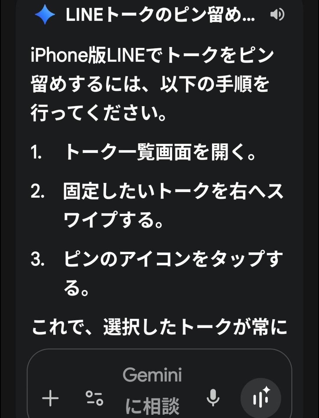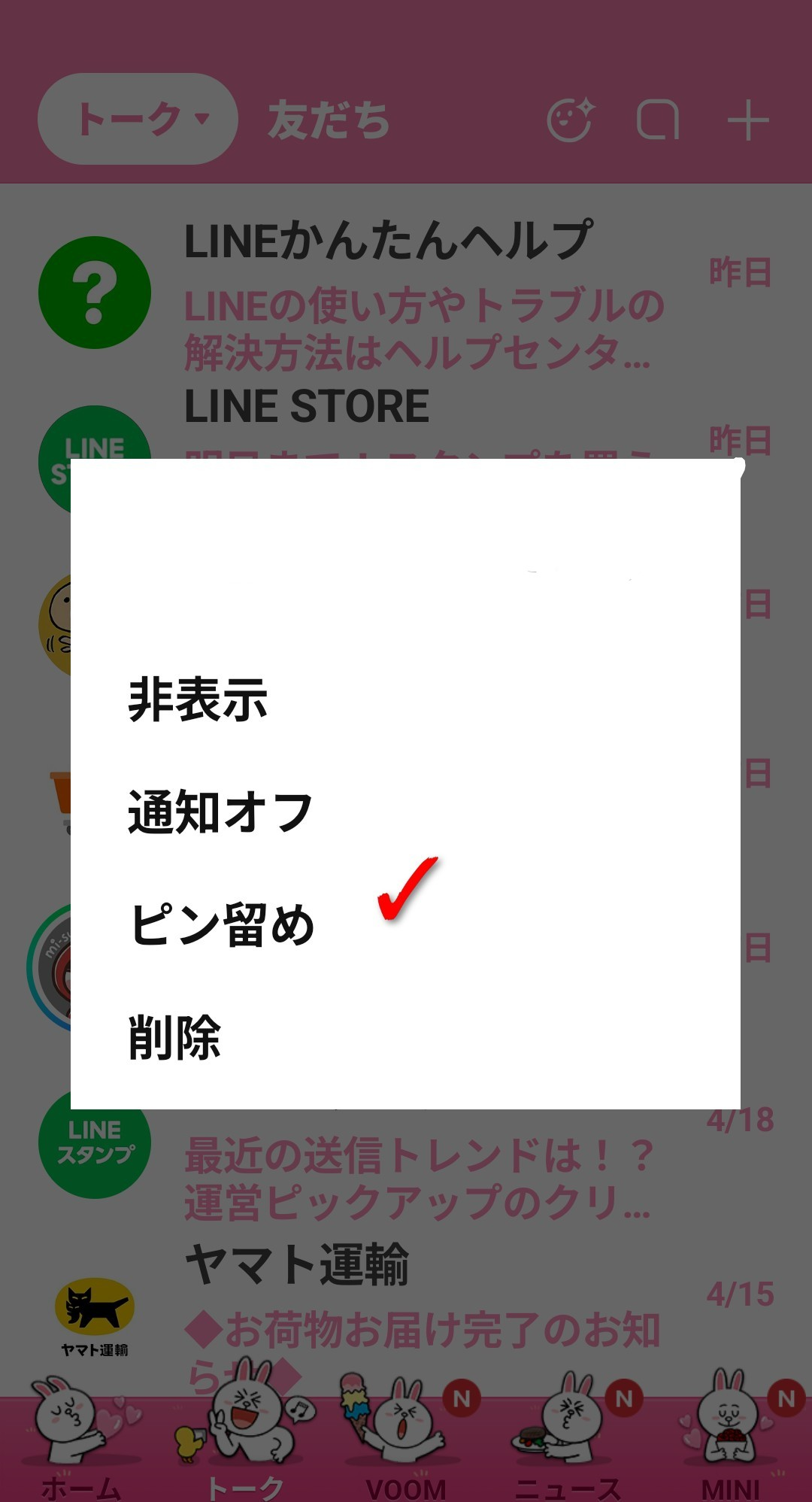2.固定したいトークを長押し、後に現れる画面でピン留めを選択する(完了)