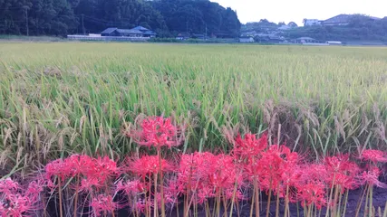 彼岸花と収穫直前の稲穂 彼岸花と収穫直前の稲穂です。10月3日頃撮りました。