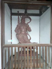 阿吽像 網のせいで判りにくいでしょうが、門の前に立っている阿吽像です。