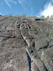 見上げてもわかりません 下から見上げるとわかりませんが離れて見るとありがたい文字が クライミングもできる岩です