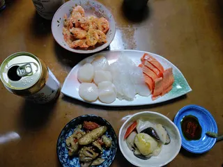 大晦日前半戦 大好きなお刺身少しと、キンピラ、煮付け、川海老です。酒のアテには充分。後半戦は手打ちそばの予定です。