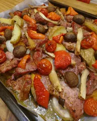 献立に困ったときに 今晩なにしょう?のときの鉄板メニューです野菜とお肉をオーブンで焼くだけ! 今夜は豚ロース、エリンギ、ブラウンマッシュ、なんきん、じゃがいも、長芋、パプリカ、玉ねぎ、ミニトマトでした