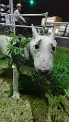 ブルテリア 芝生で転がって草が巻き付くブルテリア