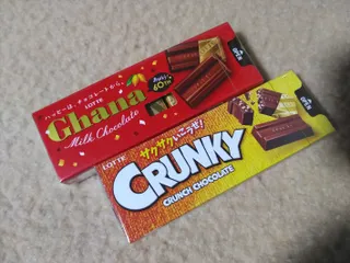 (^-^)ロッテのガーナチョコとクランキーチョコです。板チョコではなく一口サイズです。ロッテのチョコはくちどけが秀逸です。ミルク感の効いたコクのある味わいサクサクいこうぜ!