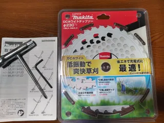 (^-^)マキタの電動刈払機の230mmチップソーです。昨日の山の草刈りでトラブルはありませんでしたが、いつ刃が欠けるかもしれず購入してきました。エンジンの刈払機より低振動である電動式なのでマキタ純正のチップソーへの交換が推奨されています。未使用品はホワイトなんです。左が現使用。右が新品。チップソー