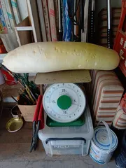 自慢 でっかいダイコン!! 家庭菜園で採れたビッグサイズのダイコンです。重さ6kg、直径15cm位あります。おでん、煮物、なます、みそ汁の具、大根おろし(みぞれ)などなどいろんな食べ方があります。食卓の救世主となっています。