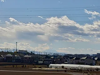 武蔵野線の背景に富士山🗻 今日のお昼頃は風が強く畑の土が舞い上がり始めていました。そんな時にホームセンターの屋上からパチリ📷️富士山は遠いいなぁ😚