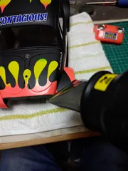 ヒートガンを当てて マキタのヒートガンでデカールをボディーに馴染ませてます。完成です 🥳 影消しを使って見ると自分の影が消えたー名車ファルコンの遺伝子を受け継ぐブリッツアビートル完成です。久しぶりのRC製作で満足です。😊
