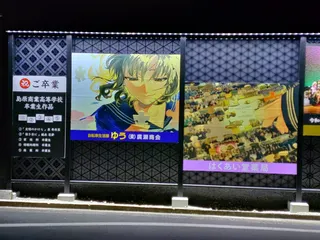 祝・卒業 地元の商業高校の卒業制作だそうです。夜のウォーキング中だったためライトアップされてとてもキレイでした。でも、最近の卒業生は80名ほどで少子化の波を切々と感じます。昔は300名弱いたと思いますが…。