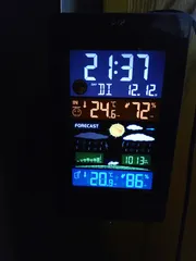 時計、ウェザーステーション。アウトドア、キャンプにぴったりの時計 電池対応のコンセント式時計。上は時計、その下本体の、中央は気圧。一番下は小型機の室外機。コンセントは常に光ります、電池はタッチやボタンを押すと数秒光ります。 日常的に使えるアウトドア時計です。こっちは主に温度湿度や気圧管理が目的かな。