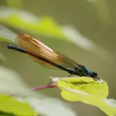 ニホンカワトンボ(?)がやってきました。葉っぱにやたら止まるのですが、何かに美味い虫がいるのでしょうか。どんどん喰って下さい。