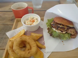 ぷらっとランチツー🎵サーフショップを併設してるハワイアンcafe行きましたよ🏝️メニューもロコモコやらガーリックシュリンプやらのハワイア〜ンそんな中からバーガーセットにしました炭焼きのチキンが香ばし〜😋スープもカリカリベーコンとオニオンの甘みが良いバランス美味しくいただきました🏍️