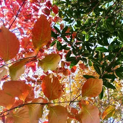 荒庭便り 紅葉始まってます。緑はキンモクセイ、赤いのはハナミヅキ、奥の黄色はサクラやカリンなど。